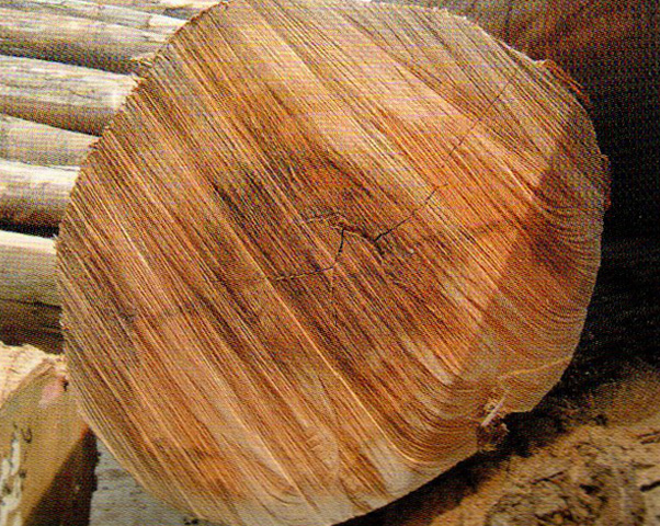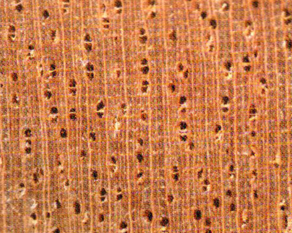 心边材区别不明显。木材浅粉红褐色至浅红褐色。生长轮不明显。