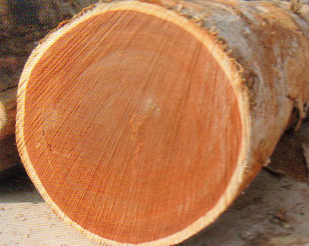 心边材区别极明显、心材暗红褐色,略具深色条纹、边材淡黄白色,厚3~4 cm。生长轮略明显。