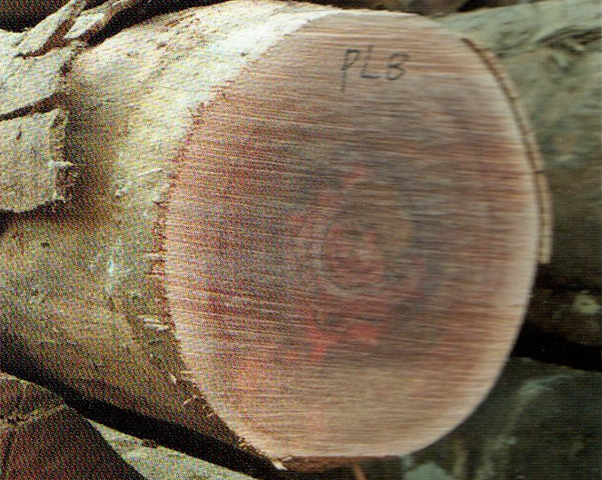 心边材略明显。心材暗红褐色带紫色调,心部具不规则花纹。边材色稍浅,宽3~4cm。生长轮略明显,轮间界以深色组织带。